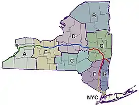 - Отряд E — округ Кейюга, округ Шеманг, округ Ливингстон, округ Монро, округ Онтарио, округ Скайлер, округ Сенека, округ Стьюбен, округ Уэйн, округ Йейтс.