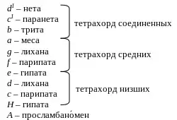 Объединение 3 тетрахордов (одинаковой структуры) без разделительного тона с просламбаноменом теория именовала Малой полной системой [2]:
