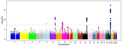 После того, как для всех SNP были рассчитаны отношения шансов и P-значение, создаётся манхэттенский график. На этом графике отрицательный логарифм от P-значения рассматривается как функция от координаты в геноме. Поэтому SNP с наиболее сильным влиянием выступают на графике. Кроме того, пороговое значение P-значения, свидетельствующее о значимости, подвергается коррекции на множественное тестирование. Пороговое значение может быть разным в разных исследованиях[28], но чаще всего оно принимается равным 5 × 10−8 для анализа, в котором рассматривались сотни тысяч и миллионы SNP[3][18][29].