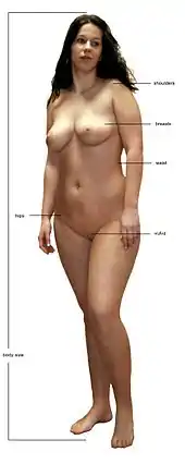 - нижний угол лобка не увенчивается выступающим вперёд и вниз половым членом, под которым свисает мошонка, а раздваивается, образуя продолжающую его переднюю поверхность скрытых между ног больших половых губ с половой щелью между ними, в которой находятся малые половые губы и преддверие влагалища с клитором, наружным отверстием женского мочеиспускательного канала и входом во влагалище