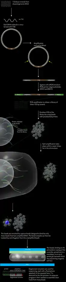 Парамагнитные шарики одинакового размера, покрыты стрептавидином и несут биотинилированные форвардные праймеры. Стрептавидин обладает очень сильной аффинностью к биотину, поэтому праймер очень прочно связан с поверхностью шарика. Водная фаза реакции содержит парамагнитные шарики, смесь компонентов для ПЦР, прямой и обратный праймеры, и библиотеку парных концевых тегов. Водная фаза перемешивается и взбалтывается с масляной фазой для получения эмульсии. В идеальной ситуации каждая капля воды в масляной эмульсии сдержит один шарик и одну молекулу матрицы ДНК, что позволяет в миллилитровом объёме проводить миллионы невзаимодействующих реакций ПЦР-амплификации.