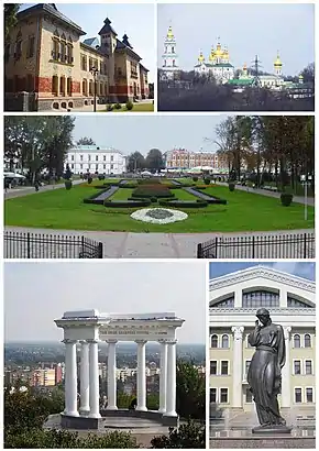 ![]() Слева направо, начиная с левого верхнего Полтавский краеведческий музей, Крестовоздвиженский монастырь, Круглая площадь, Ротонда Дружбы Народов, памятник Марусе Чурай | |||||