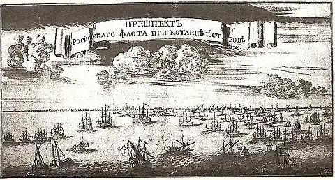 Автор — Питер Пикарт. Гравюра, 1715 год. На гравюре изображено возвращение русского флота к острову Котлину после похода в Балтийское море, где русский флот встретился с англо-голландской союзной эскадрой адмирала Нориса. На переднем плане изображены галеры, далее корабли, фрегаты, шнявы и другие суда, а на горизонте — покрытый лесом остров Котлин.