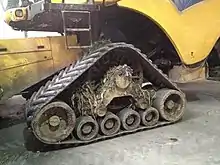 - Съёмные (как правило, резиновые либо резинометаллические) гусеничные ленты, используемые в комплекте со съёмным натяжным устройством. Натяжное устройство, применительно к одному борту, состоит из направляющего колеса и системы натяжения, подвешивается между передними и задними колёсами машины к рукаву полуоси ведущего моста; гусеничная лента при этом надевается поверх съёмного направляющего колеса и стандартного ведущего колеса, демонтаж которого не требуется[2]. Применяется на тракторах.