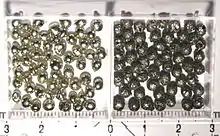 Обычно используется один количественный критерий, такой как электроотрицательность[47], металлоиды определяются по значениям электроотрицательности от 1,8 или 1,9 до 2,2[48]. Дополнительные примеры включают эффективность упаковки (доля объёма в кристаллической структуре, занятая атомами) и соотношение критериев Голдхаммера — Герцфельда[49]. Общепризнанные металлоиды имеют эффективность упаковки от 34 % до 41 %[n 4]. Отношение Голдхаммера — Герцфельда, примерно равное кубу атомного радиуса, делённого на молярный объём[57][n 5] является простой мерой того, насколько металлический элемент, признанные металлоиды имеют отношения примерно От 0,85 до 1,1 и в среднем 1,0[59][n 6]. Другие авторы полагались, например, на атомную проводимость[63] или объёмное координационное число[64].