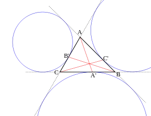 В любом треугольнике вершина и точка касания вневписанной окружности на противоположной стороне делят периметр треугольника на две равные части, то есть на два пути, длина каждого из которых равна полупериметру. На рисунке показаны стороны A, B, C и точки касания A', B', C', тогда