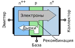 Транзистор — полупроводниковое устройство, которое состоит из двух областей с полупроводниками p- или n-типа, между которыми находится область с полупроводником n- или p-типа. Таким образом, в транзисторе есть две области p-n перехода.