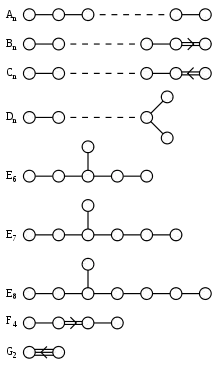 Множество называют системой корней алгебры . Можно показать, что оно действительно удовлетворяет аксиомам системы корней. В ней можно выбрать[9] базис так называемых простых корней так, что каждый элемент представляется в виде целочисленной линейной комбинации простых корней, причём либо со всеми неотрицательными коэффициентами, либо со всеми неположительными[10]. Из теории представлений следует, что для каждого из таких корней можно выбрать элементы , нормировав их так, что и Оказывается, что выбранные так элементов порождают как алгебру Ли.