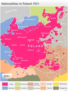 Основной линией национальной политики была полонизация национальных меньшинств. Вместе с тем, в силу международных обязательств (например, Рижского договора 1921 года), а также сопротивления со стороны национальных меньшинств, польские власти были вынуждены проводить очень осторожную языковую политику, особенно в отношении украинцев и немцев. Влияние международных обязательств на политику польских властей постепенно менялось — в 1934 году Варшава объявила о выходе из системы международно-правовой охраны национальных меньшинств[19]. Даже порядок учёта количества лиц той или иной национальности менялся. В переписи 1921 года существовал пункт о «национальной принадлежности» респондента, но в ходе переписи 1931 года вопрос о национальности не задавался, хотя спрашивали о родном языке и о вероисповедании[20]. В результате, число представителей той или иной национальности Польши на 1931 год можно определить лишь приблизительно.
