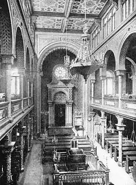 Синагога была построена в мавританском стиле с центральным куполом в виде «луковицы». Внутреннее помещение синагоги разделялось на три нефа и верхние галереи.