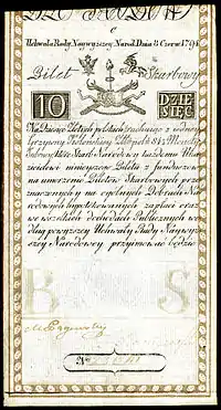 Во время восстания Тадеуша Костюшко 13 августа 1794 года повстанцы выпустили ассигнации — бумажные деньги на сумму 6,65 миллионов злотых: билеты достоинством 5, 10, 25, 50, 100, 500 и 1000 злотых, а также разменные номиналы 5 и 10 грошей, 1 и 4 злотых. Вскоре, 8 ноября того же года, Варшава была взята русскими войсками, и ассигнации были объявлены недействительными[17][3]. Вместо них в обращение были введены российские монеты и ассигнации, однако счёт на злотые и гроши сохранился[18].