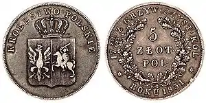 Во время Польского восстания 1830—1831 годов Национальное правительство с апреля по август 1831 года выпускало собственные «повстанческие» деньги — золотые червонцы, а также серебряные монеты достоинством 2 и 5 злотых с революционным гербом[18][19]. В условиях острого дефицита драгоценных металлов Польский банк, также попавший под контроль восставших, произвёл эмиссию бумажных банкнот достоинством 1 злотый. После поражения восстания решениями от 21 ноября (3 декабря) и 18 (30) декабря 1831 года все постановления революционного правительства в области денежного обращения были отменены. Отчеканенные им монеты подлежали изъятию из обращения и перечеканке, однако этот процесс растянулся на десятилетие — хождение революционных злотых было прекращено только в 1838 году[18].