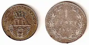 Тогда же, в 1831 году, вновь встал вопрос об основной денежной единице Царства Польского, а также о существенном сокращении его финансовой автономии. Российский министр финансов Егор Канкрин предложил немедленно «приказать вести счёт рублями, а не флоринами», имея в виду польские злотые. Однако из-за серьёзного расстройства денежного обращения в самой Империи, когда курс бумажных ассигнаций был существенно ниже их нарицательной стоимости, от этого предложения отказались, ограничившись выпуском монет с обозначением номинала в двух денежных единицах[18]. С 1832 года на Петербургском и на Варшавском монетных дворах началась чеканка монет с двойным обозначением номинала — в рублях (или копейках) и в злотых (или грошах), исходя из официального соотношения 1 злотый = 15 копеек: