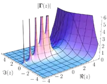 Модуль Гамма-функции . Слева (Re z<0) у функции есть полюса, в них она стремится к бесконечности. Справа (Re z>0) полюсов нет, функция всюду конечна.