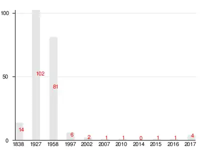 | 1838 | 1927 | 1958 | 1997 | 2007[13] | 2010[14] | 2014[15] |