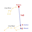 Чтобы найти Полярную звезду, надо сначала найти характерную конфигурацию из семи ярких звёзд — созвездие Большой Медведицы, напоминающее ковш (астеризм Большой Ковш), затем через две звезды (Дубхе и Мерак) «стенки» ковша, противоположной «ручке», мысленно провести линию, на которой отложить пять раз расстояние между этими крайними звёздами. Примерно в конце этой линии находится Полярная звезда. Направление на Полярную звезду совпадает с направлением на север, а её высота над горизонтом совпадает с широтой наблюдателя.