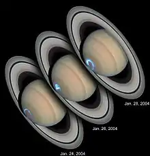Магнитные поля планет-гигантов Солнечной системы значительно сильнее магнитного поля Земли, что обусловливает больший масштаб полярных сияний этих планет по сравнению с полярными сияниями Земли. Так, высочайшим в Солнечной системе (1200 км) является северное сияние Сатурна[8][9]. Особенностью наблюдений с Земли (и вообще из внутренних областей Солнечной системы) планет-гигантов является то, что они обращены наблюдателю освещённой Солнцем стороной и в видимом диапазоне их полярные сияния теряются в отражённом солнечном свете. Однако благодаря высокому содержанию водорода в их атмосферах, излучению ионизированного водорода в ультрафиолетовом диапазоне и малому альбедо планет-гигантов в ультрафиолете, с помощью внеатмосферных телескопов (космический телескоп «Хаббл») получены достаточно чёткие изображения полярных сияний этих планет.