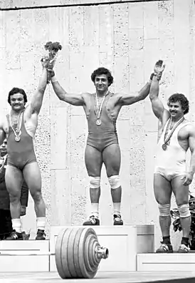 ![]() Слева направо: Благой Благоев, Юрий Варданян и Душан Полячик на пьедестале Олимпиады в Москве | |