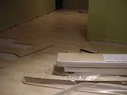 Основой современного ламината служит панель из прессованной древесины, которая перетёрта до степени образования кристаллизации. В отличие от паркета, такой вид напольного покрытия совершенно не боится влаги, к тому же данный отделочный материал снизу имеет слой влагостойкой бумаги и шумопоглощающую подложку, что также придаёт жёсткость конструкции. Износостойкость ламината зависит от качества защитной смолы (акрилатной или меламиновой), покрывающей сверху декоративный рисунок, нанесённый на специальную бумагу. Именно декоративный рисунок придаёт ламинату изысканность и практичность.
