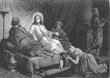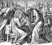 - Марией, сестрой Лазаря, в их доме в Вифании, после воскрешения Лазаря, но до входа в Иерусалим, то есть в субботу (Евангелие от Иоанна);