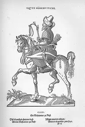 «Дворяне составляют московскую конницу, люди же, по большей части рабы, которых должны присылать знатные лица, исправляют должность денщиков вооруженного дворянства. Когда великий князь или, в его лице, царских войск воевода должен отправиться в неприятельскую землю, голос глашатая возвещает всем о времени выступления в поход и объявляет дворянам, чтобы они, с соответственным числом крепостных, явились на военную службу, после этого все вооружаются и спешно, смущенные мыслью о разных злополучных случайностях, отправляются на назначенное место. Ибо ежели, с одной стороны, дворяне боятся царского гнева в случае нерадивого исполнения его приказаний, то, с другой, они трепещут при мысли о предстоящем сражении с неприятелем, в котором может постигнуть их жалкая кончина. Они не считают делом постыдным покупать себе, нередко за большие деньги, позволение жить праздно за стенами своего дома и отделаться от военных опасностей… Оружие, которым пользуются московские всадники, суть, лук, стрелы, короткий дротик или копье, у некоторых только сабли, и все это по образцу турецкому.»[46]