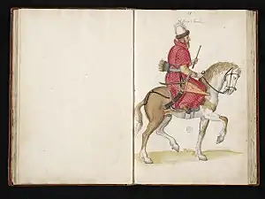 «Всадники — все стрелки из лука, и луки их подобны турецким; и, как и турки, они ездят на коротких стременах. Вооружение их состоит из металлической кольчуги и шлема на голове. У некоторых кольчуги покрыты бархатом или золотой парчой... На поле битвы они действуют без всякого строя. Они с криком бегают кругом и почти никогда не дают сражений своим врагам, но действуют только украдкой... Если человек имеет большие заслуги, то великий князь дает ему ферму или участок земли, за что получивший обязан быть готовым к походу с таким количеством людей, какое назначает князь; он же должен соображать в своем уме, что может дать этот участок и соответственно этому он обязан поставлять, что положено, когда во владениях великого князя ведутся войны...»[41]