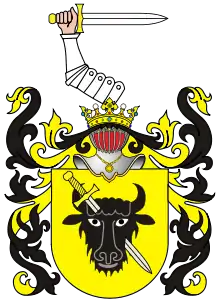 В голубом поле чёрного цвета голова зубра, проткнутая между глазами мечом от правого угла к левому. Над шлемом видна закованная в латы рука, держащая обнаженный меч. Начало герба относят к XIII веку[1].