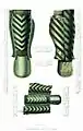 Поножи обычно состояли из трёх выгнутых металлических пластин. Сзади они соединялись ремнями и пряжками. Как и наручи, изнутри поножи подбивались тканью. Наружная поверхность пластин могла быть гладкой или украшенной рельефным рисунком. Богатые поножи отделывались позолотой, насечками, каймой из бахромы.
