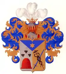 Щит четверочастный. В первом и четвертом серебряных полях по черному орлиному крылу с золотой шестиконечной звездой на нем, во втором лазуревом поле горящее сердце, в третьем червленом поле золотой крест, обремененный пчелой, летящей вверх. Над щитом дворянский коронованный шлем с тремя павлиньими перьями. Намет: золотой и червленый, подложенный лазуревым и серебром[1].