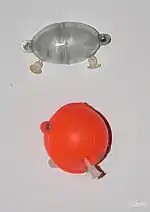 Производители выпускают также пустотелые поплавки-грузила в форме шара. Как правило, они склеены из двух полусфер из прозрачного оргстекла. В них создают два отверстия для заполнения водой и опорожнения. Отверстия закрываются пробочками. Вес поплавка и его грузоподъёмность регулируются различной степенью наполнения водой. Поплавок снабжен двумя диаметрально расположенными проушинами для лески и поводка. Так как такой поплавок в воде очень похож на пузырь, рыба его не боится, и поэтому его применяют при ловле очень пугливой рыбы, такой как голавль[2][4].