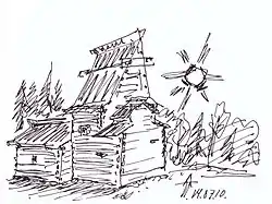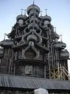 ![]() Александр Попов на лесах около реставрируемой им церкви Ризоположения из села Бородава (справа). На заднем плане слева и сверху — конструкции временного технологического павильона | |