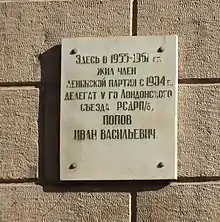 На доме (ул. Ушинского, 6 / ул. Пушкина, 2), где проживал Попов, была установлена мемориальная доска с текстом: «Здесь в 1955—1961 гг жил член Ленинской партии с 1905 г., делегат V-го съезда РСДРП(Б) Попов Иван Васильевич»[2].