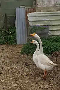 - Гуси белые, менее крупные, но весьма плодовитые; шишка и клюв оранжевые.