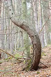 - Кривизна — отклонение продольной оси сортимента от прямой линии, обусловленное искривлением ствола. При измерении кривизны комлевых лесоматериалов первый метр от нижнего торца в расчёт не принимают. Увеличивает количество отходов, снижает прочность на сжатие при использовании в круглом виде, при распиле появляется искусственный косослой:
