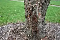 - ребристая закомелистость — ствол дерева внизу имеет рёбра и углубления (ройки[3]), связанные с корневыми наплывами; поперечное сечение имеет неправильную многолопастную форму. При распиле на доски большую часть ствола выбраковывают в отходы, поскольку такие доски сильно коробятся и имеют пониженную прочность.