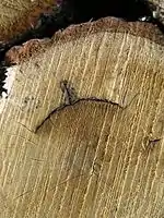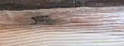 - Червоточина — ходы и отверстия, проделанные в древесине насекомыми-ксилофагами и их личинками, такими как жуки-короеды, жуки-усачи, долгоносики, домовые жуки-точильщики, некоторые виды муравьёв, бабочки-древоточцы и стеклянницы, термиты, и таким же образом двустворчатыми моллюсками из семейства терединовые и рачками из родов Limnoria и Sphaeroma из отряда равноногих[21]. Неглубокая и глубокая червоточины могут снизить прочность древесины. Поражение червоточиной обычно влечёт за собой появление заболонных грибных окрасок, побурения и заболонной гнили (см. грибные поражения древесины). Наличие живых личинок говорит о продолжающемся развитии червоточин; в окорённых материалах оно быстро останавливается, а в неокорённых может продолжаться до созревания личинок. В сухой древесине поселяются другие виды насекомых-вредителей. Исчисляется червоточина количеством на 1 погонный метр материала, а в фанере — на 1 лист. Червоточины различаются по глубине: