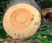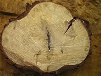 - Сердцевина — узкая (около 5 мм) центральная часть ствола, состоящая из рыхлой ткани бурого или более светлого, чем окружающая древесина, цвета. Сортименты с сердцевиной, особенно с двойной, легко растрескиваются. Имеются два отклонения положения сердцевины: