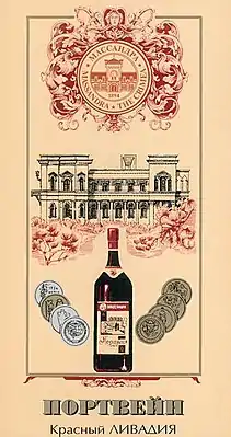 ![]() Массандра. Ливадийский дворец на буклете Портвейна красного Ливадия. 2003 год | |