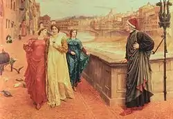 Впервые он говорил с нею в 1274 году, когда ему было 9 лет (ей же было 8). Это было на майском празднике во Флоренции, в её доме, когда отец Данте взял его с собой в гости. Об этом Данте сообщает в своём первом произведении La Vita nuova[1]. От этой первой встречи и первой любви у Данте остались впечатления на всю жизнь, которые в дальнейшем только усиливались.