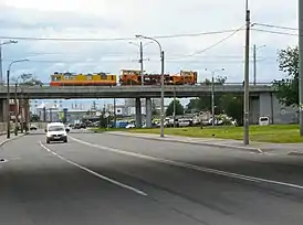 Вид на Портовую улицу и станцию «Автово» с путепровода на проспекте Стачек