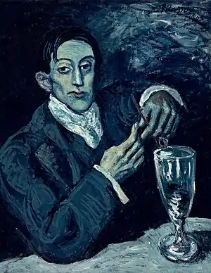 На картине изображён друг Пабло Пикассо художник Анхель Фернандес де Сото. Он сидит за столом, окутанный табачным дымом. Перед ним бокал с абсентом, в его руках курительная трубка. Молодой человек одет по последней моде. На нём тёмный элегантный сюртук, белая рубашка и жилет. Острый взгляд его больших черных глаз выражает скучающее презрение. И только оттопыренное розовое ухо выдаёт в нём весёлого кутилу. Написанный беспорядочными мазками тёмно-синий фон картины контрастирует с болезненно-бледным лицом Анхеля.