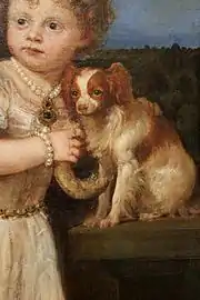 Тициан вводил комнатную собачку во многие свои произведения, где она играет разные смысловые роли. На портрете Клариссы собачка, имеющая коричнево-белый окрас и являющаяся одной из пород спаниелей[9] (по другому источнику — «собачка мальтийской породы»[13]), указывает вместе с парой лебедей на заднем плане на близость девочки к природе. У девочки и собачки даже есть схожие черты — широко раскрытые глаза и нос-пуговка. В отличие от других работ Тициана, в которых появляется подобная собачка, на портрете Клариссы она не играет, не лежит, как на портрете сеньоры Гонзаго, и тем более не спит (как, например, на картине «Венера Урбинская»), а чинно сидит на столике, опираясь на задние лапы, что соответствует общему настрою парадного портрета. Поэтому хотя собачка и вносит оттенок лёгкости в полную роскоши сцену, но вместе с тем внимательный, настороженный взгляд животного создаёт ощущение, что оно чувствует потенциальную угрозу и защищает девочку[6]. Это впечатление усиливается, если обратить внимание на то, что спина собачки (ближе к хвосту) несколько неестественно вывернута, её тело направлено в сторону Клариссы, и только лишь голова повёрнута к зрителю[9]. Кроме того, собачка, находящаяся под опекой девочки, сама является для Тициана символом детства в том его аспекте, который связан с обучением и воспитанием в ребёнке желаемых добродетелей. Собачка, которая предстаёт на картине уже хорошо вышколенной, указывает на процесс обучения, который проходит Кларисса[7].