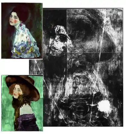 В 1996 году было сделано открытие: полотно оказалось единственной известной на сегодняшний день «двойной» (то есть впоследствии переписанной) работой Густава Климта[2][3][4][5]. 18-летняя студентка Клаудиа Мага (итал. Claudia Maga)[6], специализирующая по истории искусств, обратила внимание на схожесть поз женщин на картине «Портрет женщины» и на другой, считавшейся утраченной картине 1910 года. Она сделала фотокопии обеих работ, а затем с помощью кальки наложила друг на друга; силуэты женщин идеально совпали. Свою догадку Мага озвучила директору музея, который решил провести рентгеновское исследования картины. После изучения полученных снимков (см. иллюстрацию ниже), догадка студентки была подтверждена. Этому открытию была посвящена документальная программа телеканала BBC[7] и готовящаяся выставка, в преддверии которой полотно было похищено[4].