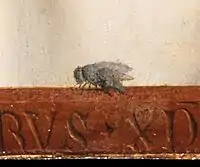 У нижней планки изображена муха. Вместе с нарисованной рамой и другими деталями она является частью приёма, который известен как обманка, или тромплёй (фр. trompe-l'œil — «обман зрения»). Он применялся художниками для создания оптической иллюзии трёхмерного пространства на двумерной поверхности. С одной стороны, муха могла символизировать тленность всего живого, а с другой — она могла рассматриваться как талисман против злых сил[13]. Как и надпись на нижней планке картины, эта виртуозно исполненная деталь также является свидетельством влияния Яна ван Эйка на творчество Кристуса[17].