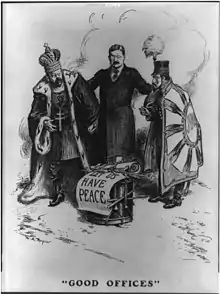 В связи с прояпонской позицией Т. Рузвельта, оказывавшего Японии огромную финансовую поддержку, японская сторона обратилась за содействием к США. 18 апреля 1905 года японский посланник в США Такахира попросил Рузвельта выступить с предложением о мире. В качестве предварительного требования американской стороны Рузвельт поставил перед Японией условие — соблюдать в Китае принцип «открытых дверей» и эвакуировать по окончании войны свои силы из Маньчжурии. Япония дала требуемые обязательства нотой от 24 апреля 1905 года. Президент США Теодор Рузвельт был решительно настроен содействовать скорейшему заключению мирного соглашения, «прежде чем Япония вытеснит Россию из Восточной Азии». По его словам, лучше, если Россия «будет оставлена лицом к лицу с Японией, с тем чтобы они могли оказывать друг на друга сдерживающее влияние»[1].