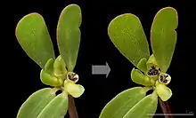 Цветки мелкие, жёлтые, сидячие, собраны пучками по два — три в разветвлениях стебля или в пазухах листьев.
