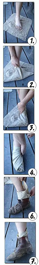 - В случае намокания (запотевания) портянки её возможно перемотать другим (то есть — сухим) краем на стопу;