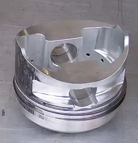 Его форма зависит от типа двигателя, смесеобразования, расположения свечей, форсунок, клапанов, метода организации газообмена в цилиндре[7]. Вогнутое днище поршня образует компактную форму камеры сгорания (дизеля, бензиновые с высокой степенью сжатия и хорошей топливной экономичностью), однако при этом есть склонность к образованию нагара. При выпуклой форме днища увеличивается прочность поршня, однако камера сгорания приобретает линзовидную форму, что увеличивает теплоотдачу. Однако в искровых ДВС увеличение теплоотдачи может позволить увеличить допустимую степень сжатия[8], что частично компенсирует потери. Плоское днище — промежуточное по форме, и самое простое в изготовлении — популярно в бензиновых ДВС и вихрекамерных/предкамерных дизелях. В устаревших двухтактных ДВС днище имело выступ-дефлектор для отклонения горючей смеси при продувке и уменьшения её выброса[9]. В дизелях с объёмным смесеобразованием форма днища обеспечивает подачу топлива в объём воздуха, с плёночным — большая часть топлива подаётся на стенку поршня (распространение в последние годы системы впрыска Common rail решило спор о смесеобразовании в автомобильных дизелях в пользу объёмного).
