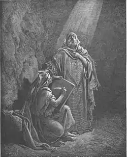 ![]() Варух записывает пророчества Иеремии. Гравюра Гюстава Доре. | |