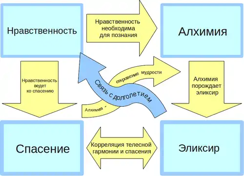 Данная схема взаимосвязей, согласно мнению Э. Брема, позволяет провести аналогию между тантрической йогой и алхимией. В индийской философии духовное развитие личности не только сопутствует, но и необходимо для создания эликсира посредством алхимии и достижения физического бессмертия. Роджер Бэкон, таким образом, создал систему взглядов, соответствующую основной идее Мадхвы, который учил, что алхимию не следует рассматривать лишь как науку о синтезе ценного металла, но как путь к сохранению тела, как средство к высоким целям освобождения[63].